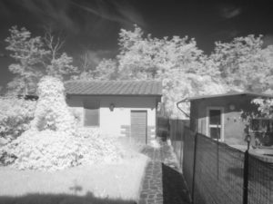 In questa immagine si può notare come la pianta sulla sinistra risulti bianchissima (riflette molto IR) mentre gli edifici sono meno influenzati rispetto alla vegetazione.
