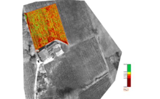 Ortopanoramica di un vigneto , con elaborazione NDVI di una porzione